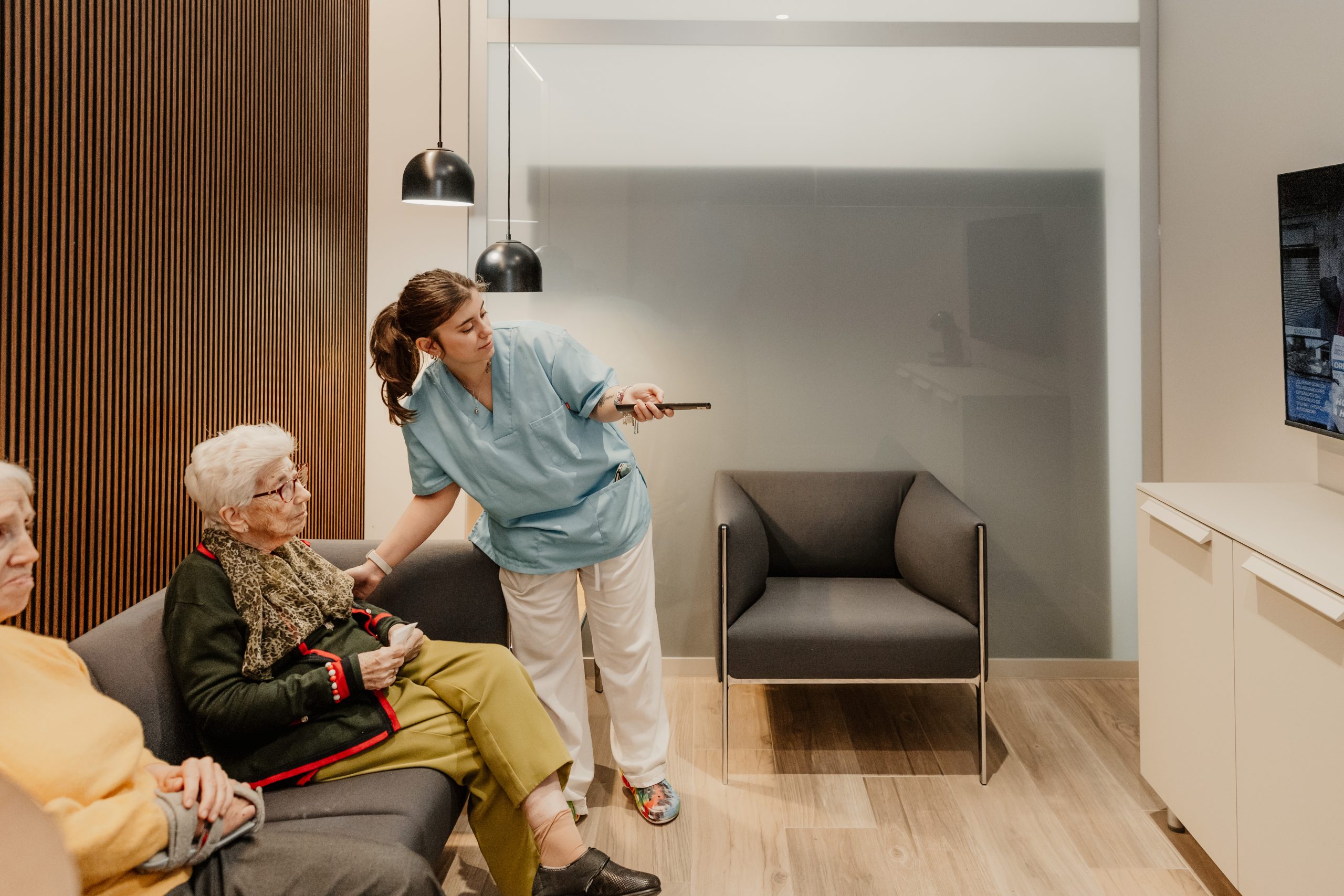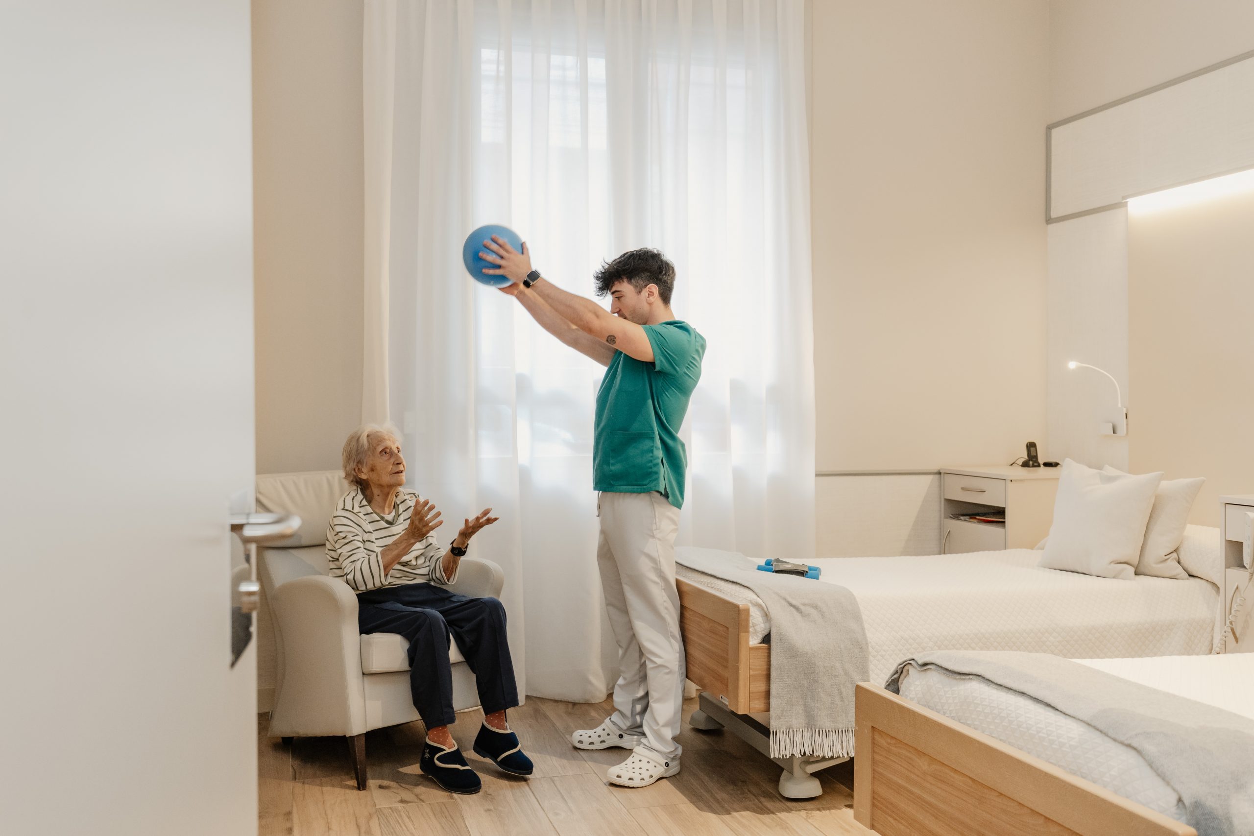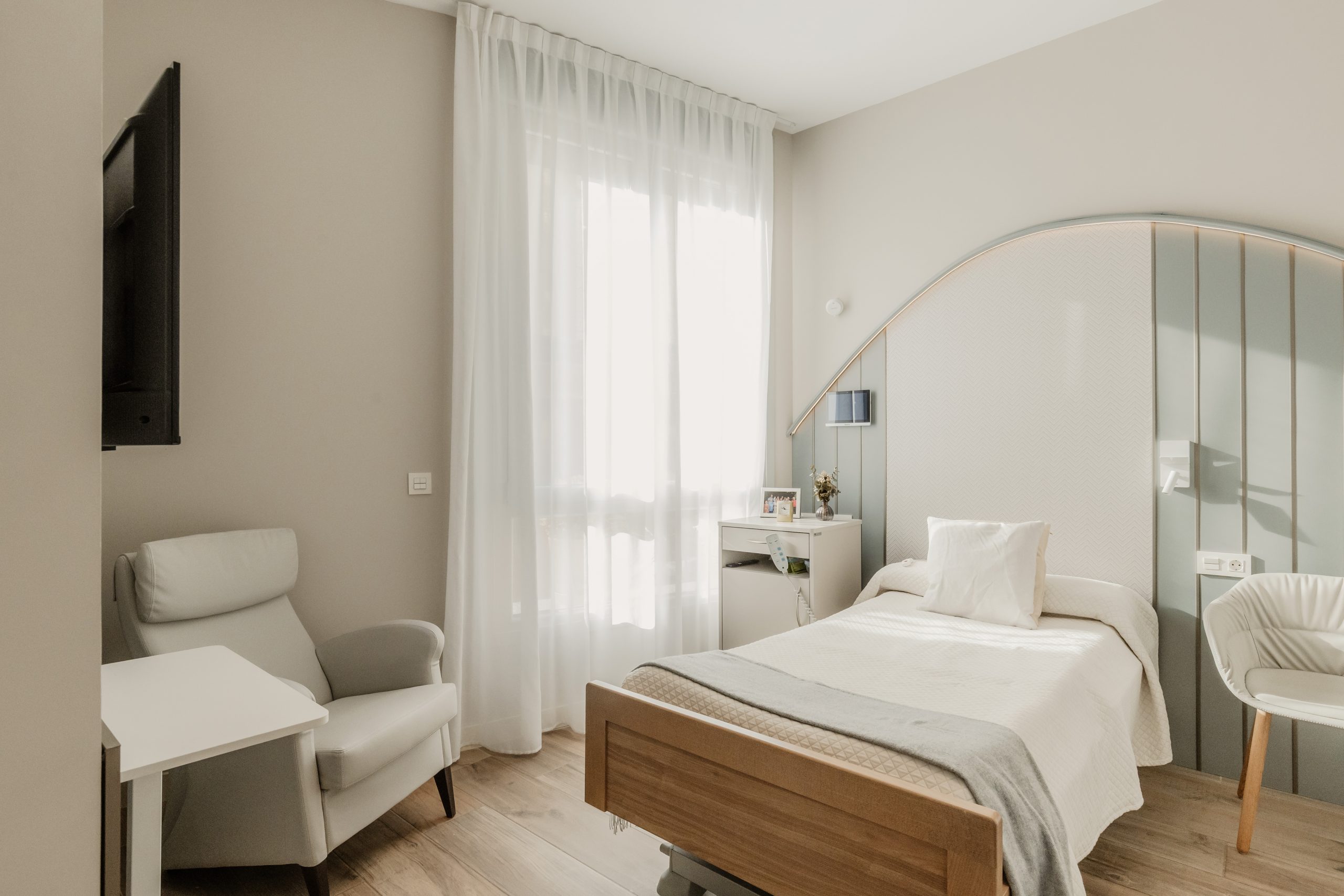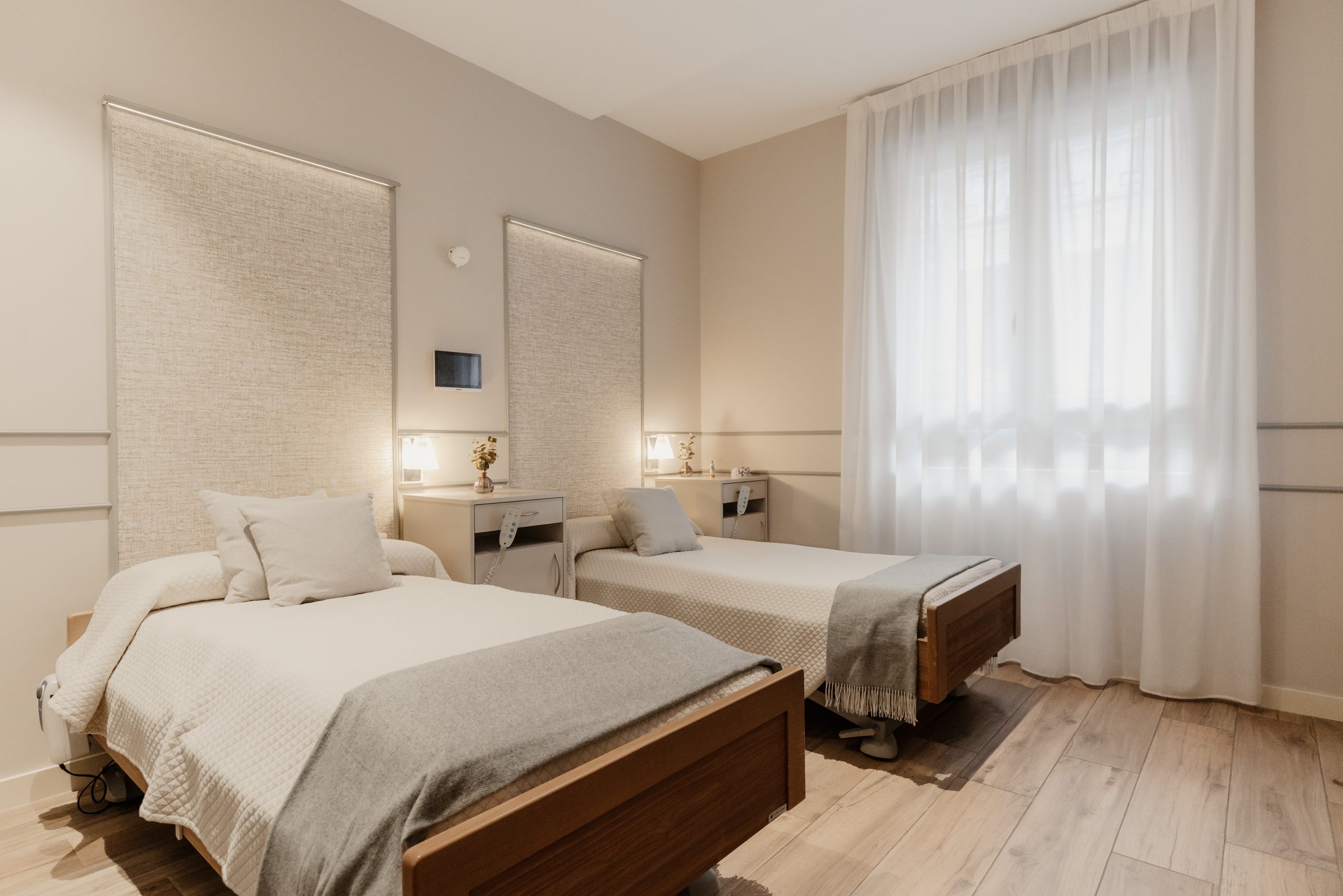 Habitaciones Confortables y Personalizables: Al igual que en un «care hotel», nuestros residentes disfrutan de habitaciones individuales y dobles, decoradas al detalle, equipadas con baño adaptado y tecnología domótica avanzada, que incluye sistemas de llamada paciente-enfermera de última generación, cama articulada alta gama (cuota 0), control de errantes mediante cámara de reconocimiento facial, sensores de deras detección de caídas, televisión HD 50’’, frigorífico, control inteligente de iluminación y temperatura, y otras funcionalidades innovadoras diseñadas para garantizar la seguridad, la comodidad y promover la independencia de nuestros residentes.